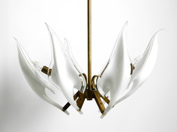 Prachtige grote messing kroonluchter uit 1950 met wit en doorzichtig Murano glas van Franco Luce | Made in Italy