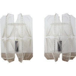Paar vintage "Diabolo" wandlampen in glanzend verguld messing van René Mathieu, 1950