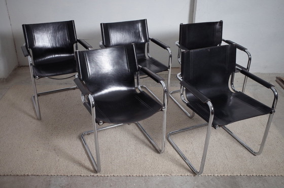 We are selling 1 very nice Matteo Grassi cantilever chair in black. This is the MG 5 model, in which the leather surface is closed, i.e. the seat and backrest are joined together. This not only looks particularly elegant, but also offers a high level of seating comfort. The saddle leather is of very high quality and has normal signs of use due to its age, which give it an authentic and beautiful patina. All in all, a very good vintage condition. The chairs are embossed on the back.