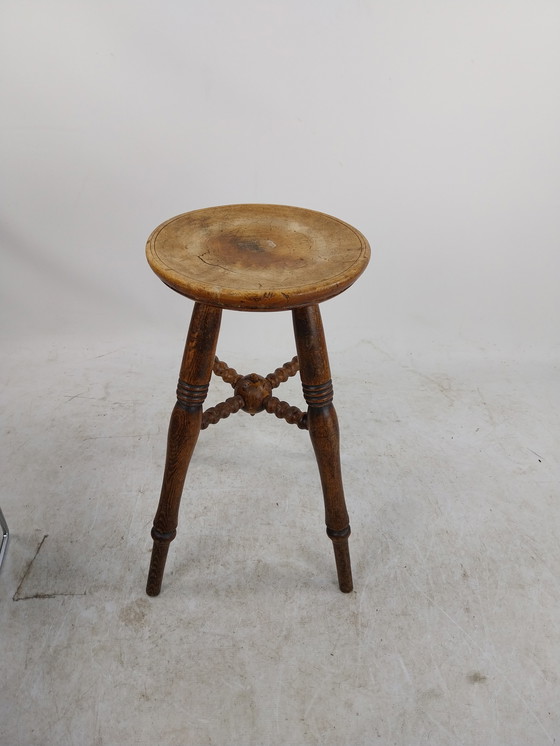 This is a 17th-century English stool, standing at 52cm tall. Crafted from wood, it features a classic vintage design with turned legs and a round seat. Its historical charm is evident in the detailed craftsmanship, making it a unique addition to any collection or decor.