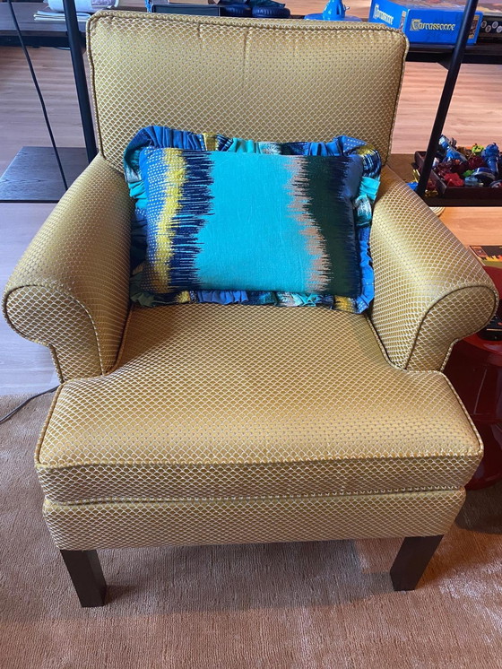 Armchair Antonia by Pierre Frey, barely sat on. Chair has stood model in showroom. Has been in the attic for 2 years, so not sat on since. Fabric still very nice except the front of the armrests. The chair is upholstered in woven jacquard fabric by Pierre Frey called: Okinawa Curry. The listed price is per 2 pieces, one green and one yellow. If you are interested in either chair, we should discuss.