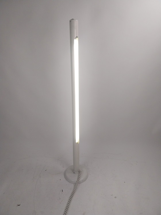 The lamp is 140 cm tall and equipped with a fluorescent tube that emits bright and efficient light, ideal for illuminating large spaces or creating an atmospheric ambiance in your living room or office. The sturdy base and durable materials ensure stability and longevity.