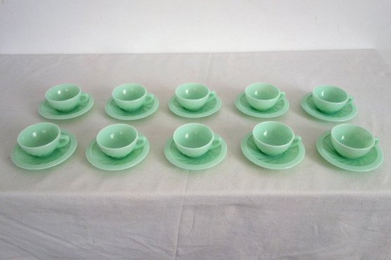 Set of 10 almond green opaline coffee cups and saucers in the Art Deco style.