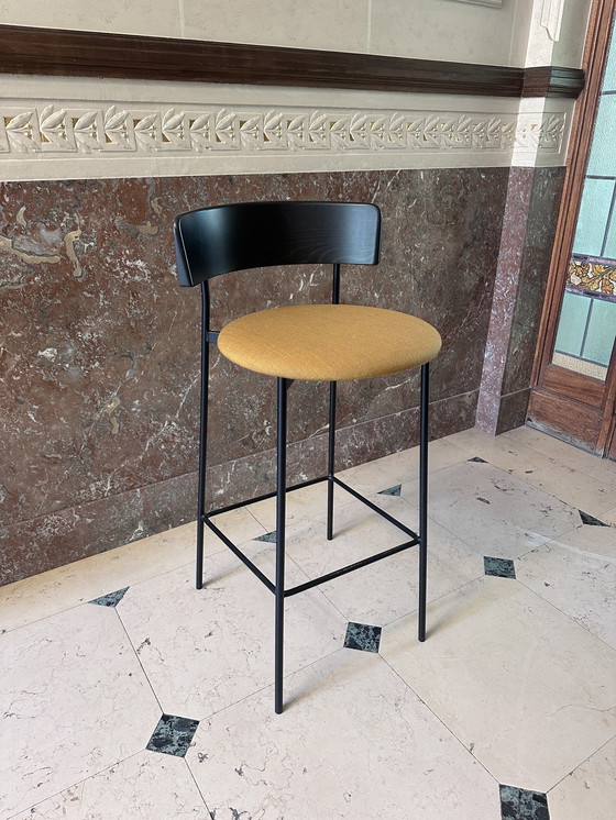 This set of 10 bar chairs from the brand KVADRAT combines modern design with comfort. The chairs have a sturdy metal construction and feature a comfortable textile seat in a striking orange color. The sleek black frame creates a contemporary look, perfect for modern interiors. Ideal for use in kitchens, bars or dining areas.