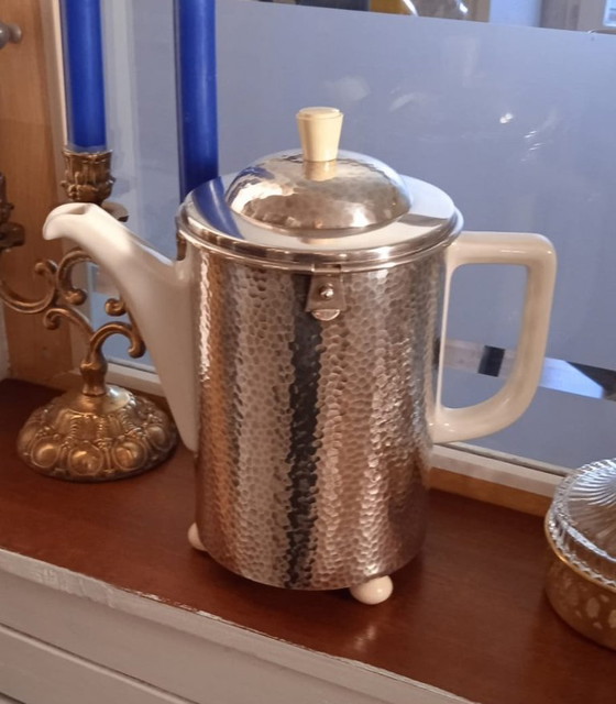 Materials: Silver-plated metal (often a "thermo" version for better insulation) with a Bakelite handle and feet.