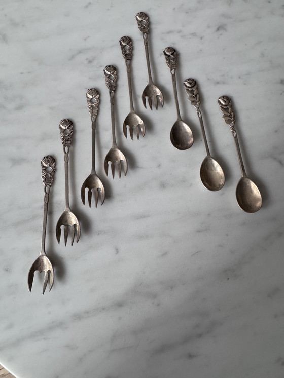 Set of 17 vintage European dessert forks and spoons in solid 800 silver (80% purity).