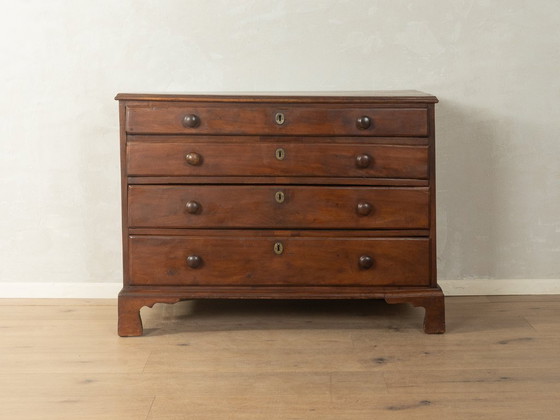 Linen Press chest of drawers from the Victorian era around 1840, distinguished by its intricate woodwork. The design of the chest of drawers with four drawers reflects the era's pursuit of craftsmanship perfection. The natural grain of the dark brown wood is artfully showcased. The piece has been carefully cleaned and is in good vintage condition.