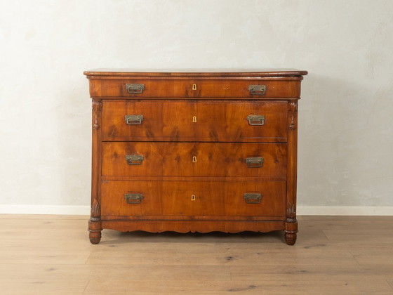 Chest of drawers from the Wilhelminian era around 1880, captivating with its artistic woodwork. The design of the chest of drawers with a hinged storage compartment and three drawers reflects the era's pursuit of craftsmanship perfection. The natural grain of the dark brown cherry wood appears artfully staged. The piece has been carefully cleaned and is in good vintage condition.