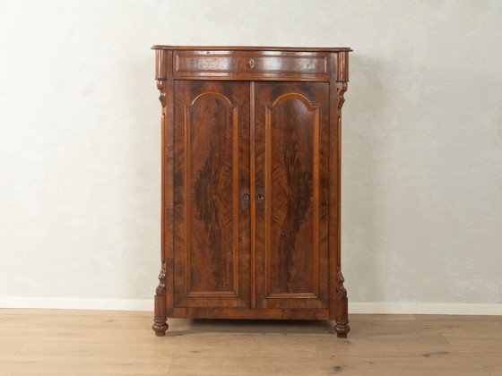 Commode from the Wilhelminian era around 1880, which captivates with its artistic wood craftsmanship. The design of the commode with two doors and a drawer reflects the era's pursuit of artisanal perfection. The natural grain of the dark brown walnut wood is artfully showcased by the mirrored veneer pattern. The piece has been carefully cleaned and is in good vintage condition.