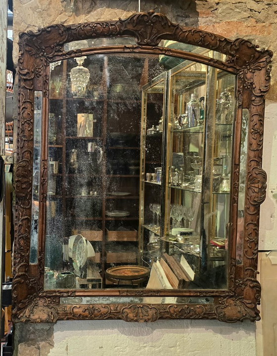 Carved wooden mirror, 18th century, first half or middle. Openwork frame decorated with scrolls, tendrils, and foliage in the Louis XV style, with scalloped lines and an asymmetrical composition.