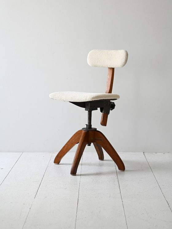 Swivel office chair from the 1920s–30s in solid oak with adjustable mechanism and new white cotton bouclé upholstery.