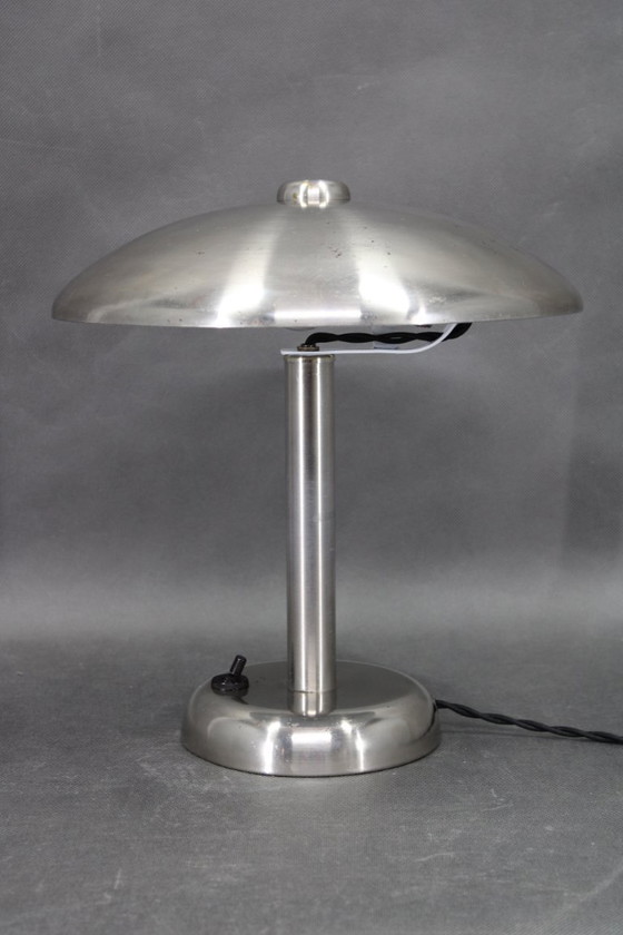 Authentic 1930s European Art Deco table lamp crafted in nickel plated metal. The iconic mushroom dome silhouette reflects early modernist and Bauhaus-influenced design language, emphasizing symmetry, material purity, and architectural simplicity.
