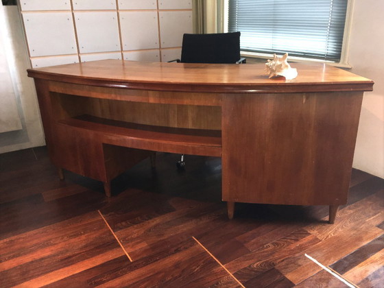 Discover the timeless charm of this unique 1930s pearwood desk, a masterpiece of craftsmanship that combines elegance and functionality. Originally designed for a general practitioner in The Hague, this desk offers a warm, inviting look that fits perfectly in both a home and work environment. The gently curved top in a friendly fan shape makes it a striking piece in any room. With a drawer cabinet on the left and a cabinet with a door on the right, the desk offers ample storage space. The concealed pull-out leaf on the right adds extra functionality.