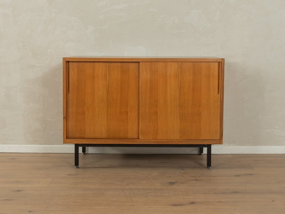 Wonderful chest of drawers in Scandinavian style from the 1950s. Body in walnut veneer with two sliding doors, a shelf, and new square steel legs in black. The doors have been coated with black Resopal. The design is attributed to Bauhaus student Franz Ehrlich.