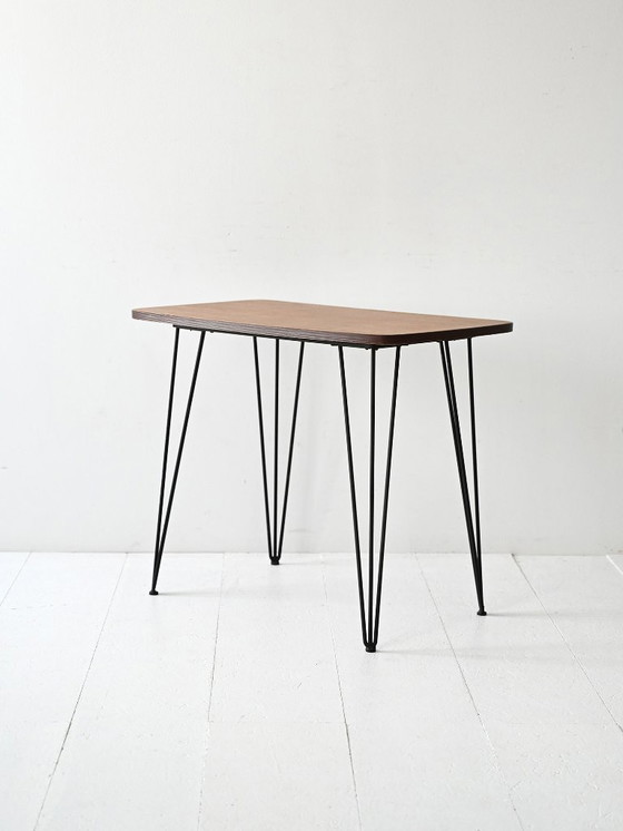 Clean lines and balanced proportions define this 1950s Scandinavian vintage table. The top is made of formica with a teak-like finish, showing visible wear especially along the edges. The black metal structure with slender, tapered rod legs remains sturdy and visually light. A classic expression of mid-century Nordic functionality.