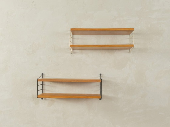 Original String shelving system designed in 1949 by Nils Strinning in ash veneer. The system consists of four black and white metal ladders with four shelves. This original String shelf is much better processed and of a better quality than many wall shelves that hit the market in the 50s and 60s. Quality features: high quality veneer, 2 cm thick shelves made of blockboard, which prevent sagging, stable shelf holders that compensate for slight unevenness, more stable ladders. Made in Sweden. Manufacturer: String Design, Designer: Nils Strinning.