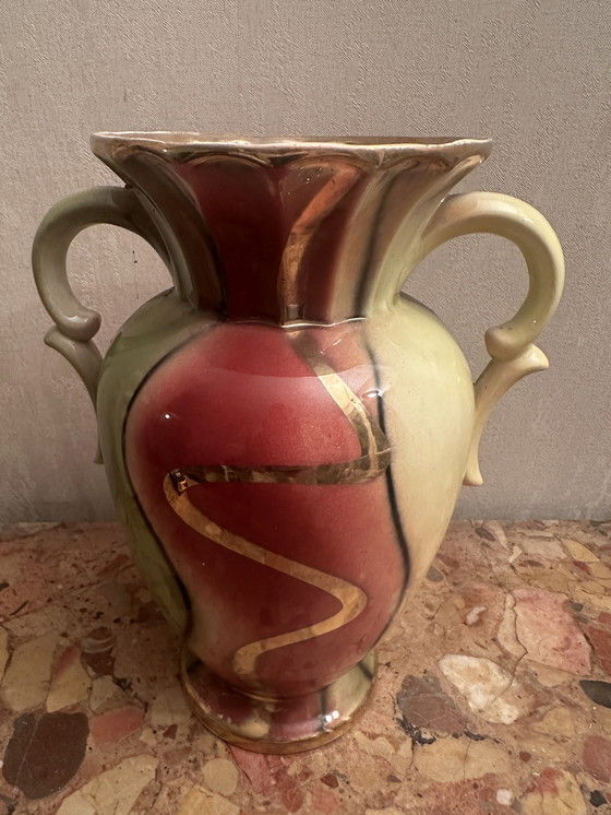 This striking 1950s West Germany ceramic vase, signed 'Foreign', showcases a vibrant blend of red, green, and gold hues. Its elegant form and bold colors make it a standout piece for any collection. Perfect for adding a touch of mid-century charm to your home decor.