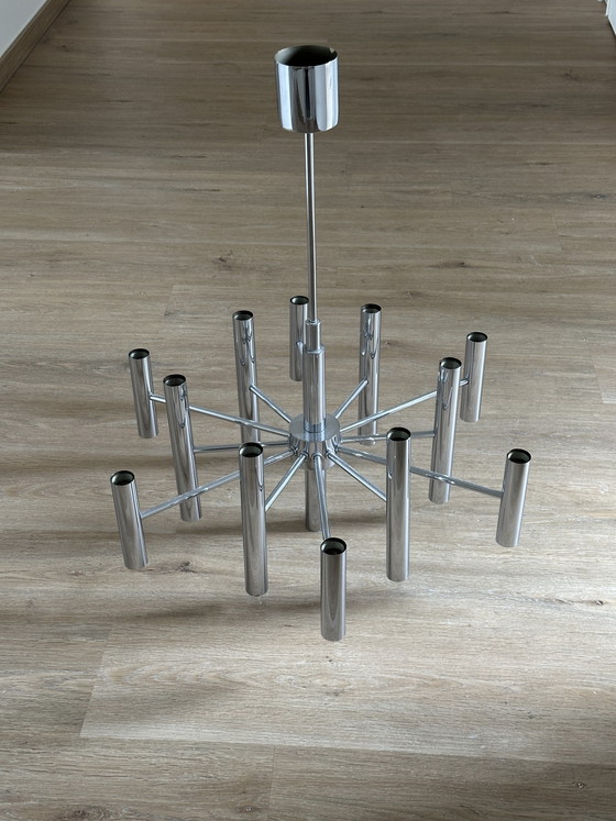 Immerse yourself in the elegance of the 1960s with this stunning Sciolari-style chandelier. This chandelier embodies Mid-Century Modern design with its clean lines and gleaming silver finish, adding a touch of sophistication to any room.