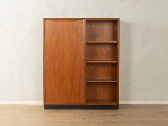 Classic 1960s chest of drawers combining open display space with practical, closed storage. Crafted from teak veneer in a warm, medium-dark brown tone and a top with black HPL coating, the piece of furniture exudes natural elegance. After careful restoration, the piece is in very good vintage condition.