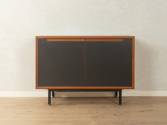 Classic chest of drawers from the 1960s with practical, closed storage behind two doors with black HPL coating. Made from teak veneer in a warm, medium-dark brown shade, and the top with black HPL coating, the corpus radiates natural elegance. The black, delicate metal frame gives the design a modern, open look. After careful restoration, the piece is in good vintage condition.