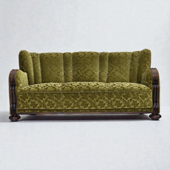 1960s, Danish 3-seater sofa. Furniture velour, carved oak wood, brass springs in the seat. Original very good condition: no smells, no stains and stable construction. Manufactured by Danish furniture maker in about 1955-60s. Original Scandinavian vintage design directly from Denmark. The sofa was checked by craftsman.