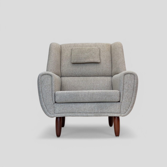 1960s Danish design by Kurt Østervig for Rolschau Møbler. Armchair model 61, furniture wool, teak wood. Extra armrest covers and neck pillow. The chair was reupholstered by a craftsman about 10 years ago. Very good condition: no smells, no stains, and stable construction. Manufactured by Danish furniture maker Rolschau Møbler in the 1965-70s. Original Scandinavian craftsmanship vintage design directly from Denmark. The chair was checked by a craftsman.