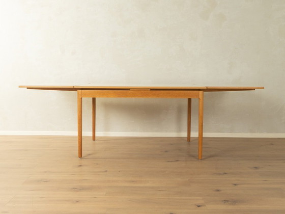 Classic extendable dining table from the 1960s in Scandinavian design. Solid oak wood frame and tabletop with solid wood edges. The tabletop and the extensions were coated with cream-white Formica.