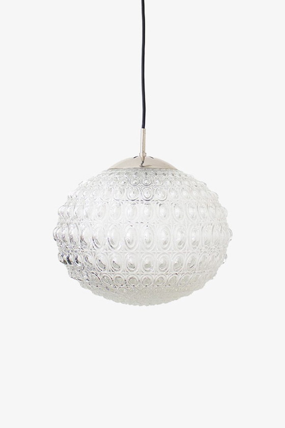 A timeless classic from the 1960s! The spherical glass shade features a striking relief with bubbles, creating a beautiful lighting effect. The glass gently and diffusely filters the light, creating a warm atmosphere. The combination of textured glass and chrome details gives the lamp a luxurious touch.