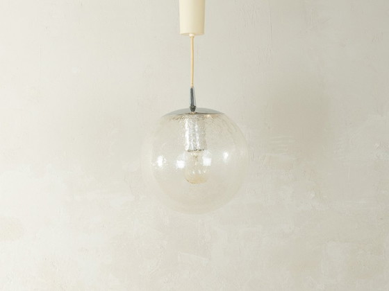 Elegant pendant lamp from the 1960s combines clear Mid-Century design with a fascinating lighting effect. The German manufacturer Peill & Putzler is known for outstanding glass craftsmanship and timeless designs of this era. The spherical shade made of transparent, intricately textured glass creates an exciting contrast to the cool, chrome-plated suspension. This vintage piece has been carefully cleaned and is in very good condition.
