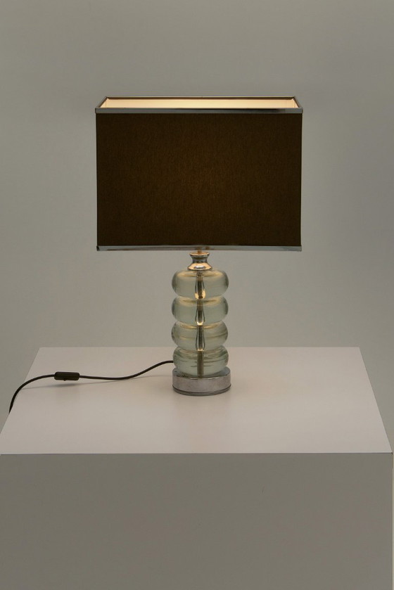 The lamp consists of round crystal elements placed on a metal base. The brown fabric lampshade provides a warm ambience while contrasting with the crystal base.