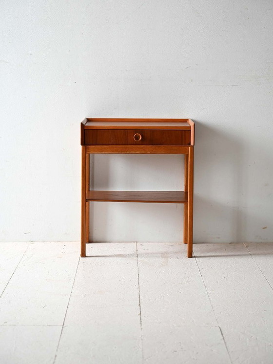 1960s Scandinavian vintage teak and oak nightstand with bicolour cylindrical handle, raised top edge, and lower shelf.
