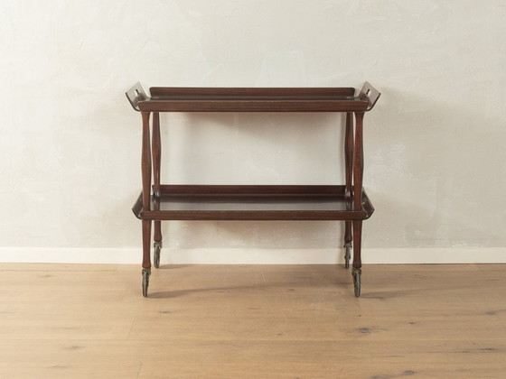 Classic serving cart from the 1960s. Solid macore frame with two shelves in macore veneer and brass castors.