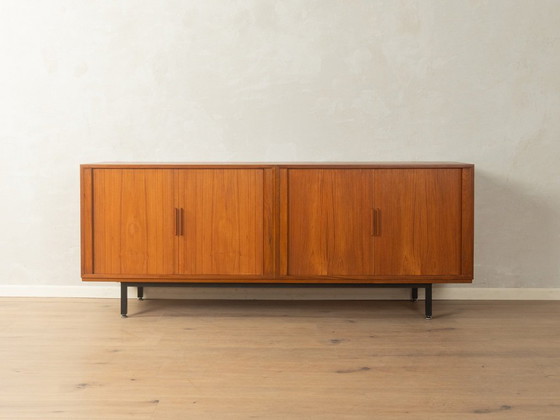 Unique sideboard from the 1960s by Kai Kristiansen for FM Møbler. High-quality corpus in teak veneer with four tambour doors, a shelf, record compartments, and new square steel feet in black.