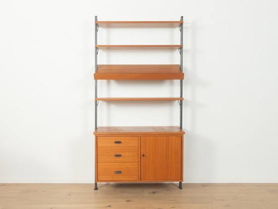 Modular wall shelf in mid-century design that combines Scandinavian lightness with functional sophistication. The design by Olof Pira for Planmöbel from the 1960s represents the progressive living culture of this era. Delicate black metal ladders form the structural backbone, while the slanted magazine rack and distinctive rectangular handles add subtle graphic accents. Warm teak veneer in a rich, medium-dark brown tone creates an appealing contrast to the cool metal braces. The spacious cabinet element with drawers and door reflects high craftsmanship. The carefully refurbished wall shelf is in good vintage condition.