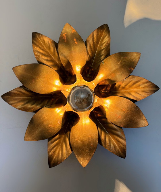 Beautiful 1970s flower wall or ceiling light with gold leaf petals in the style of Hans Kogl, in good overall condition (the patina adds to its charm), for a standard screw-in bulb.