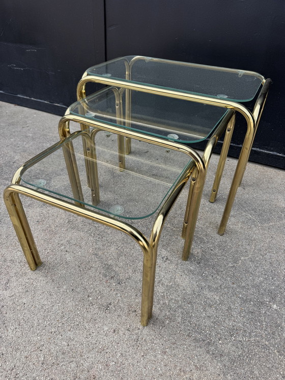 Beautiful set of three small nesting tables from the 1970s/80s in gold-tone metal and glass; very good overall condition (slight patina on the metal).