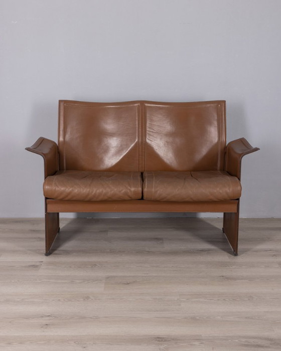 Brown leather two-seater sofa, 'Korium' model, designed by Tito Agnoli for Matteo Grassi, 1970s.