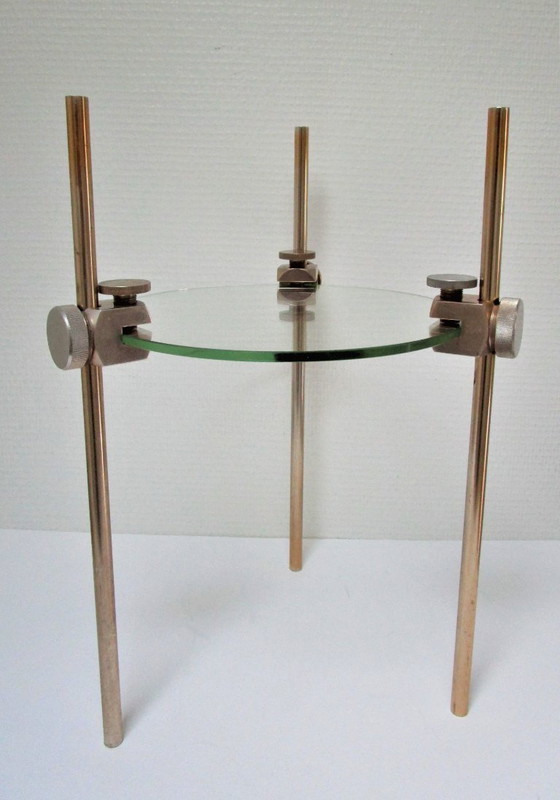 Three solid metal supports with screws allow for height adjustment and secure the glass top.
