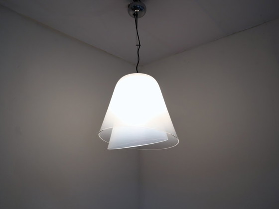 Designed and produced by Lamperti in the 1970s, the "Giglio" model is a masterpiece of Italian glass engineering. It features a sophisticated double-dome structure: an inner core in milky white lattimo glass for soft diffusion and an outer crystalline layer that creates a brilliant architectural halo. The unit is suspended by a minimalist chromed steel mount with an adjustable technical cable system.