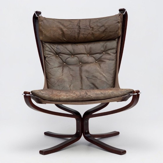1970s, Norwegian design by Sigurd Ressel. Armchair model "Falcon". Original brown furniture leather, dark bent beech wood, canvas. Original good condition: no smells, no stains and stable construction. Leather with very nice patina. Manufactured by Norwegian furniture maker Vatne Møbler in about 1970-75s. Original Scandinavian vintage design directly from Denmark. The chair was checked by craftsman.