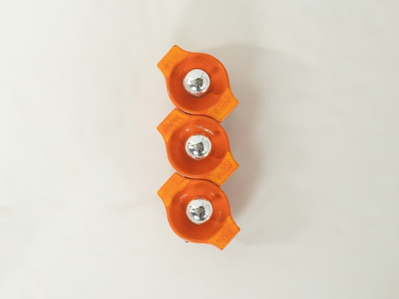 Space Age wall lamp from the 1970s by Cari Zalloni for Leola. High-quality ceramic frame in orange with three E14 sockets.