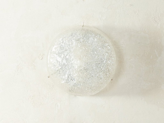 Elegant wall and ceiling light from the 1970s, whose textured glass creates a fascinating play of light. The minimalist mid-century design puts the distinctive glass shade in the spotlight. Held by a discreet metal bracket, the piece can be flexibly displayed as a wall or ceiling light. The carefully cleaned item is in very good vintage condition.