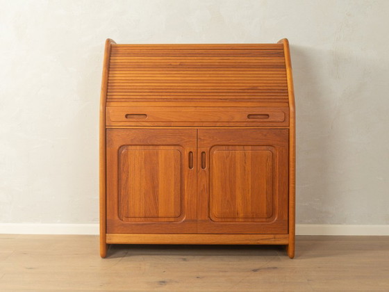 Classic secretary from the 1980s. High-quality solid corpus made of teak with two cabinet doors, a pull-out writing surface with storage compartment, three internal drawers, a jalousie door, a shelf, and many compartments.
