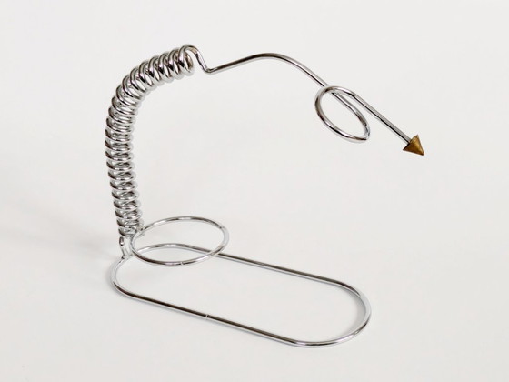 A bold 1980s postmodern wine bottle holder in the spirit of Memphis design. Crafted with a gleaming chrome finish, it features a rounded frame, a coiled support to cradle the bottle, and a whimsical wooden cone detail at the front — a sculptural touch that makes this piece stand out.