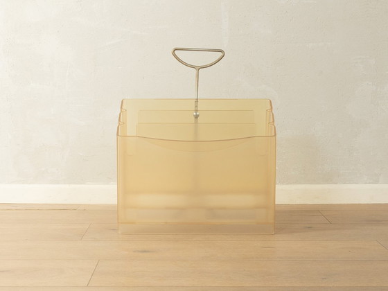 Designed in the 1990s by the renowned designer duo Andries and Hiroko van Onck for the Italian manufacturer Magis, this newspaper stand reflects the experimental spirit of postmodernism. Made from sturdy, transparent plastic by Inipress, the piece demonstrates high material quality that easily withstands everyday use. The delicate metal carrying handle provides a cool, elegant contrast. A subtle manufacturer’s mark on the underside confirms the authenticity of this carefully cleaned item.