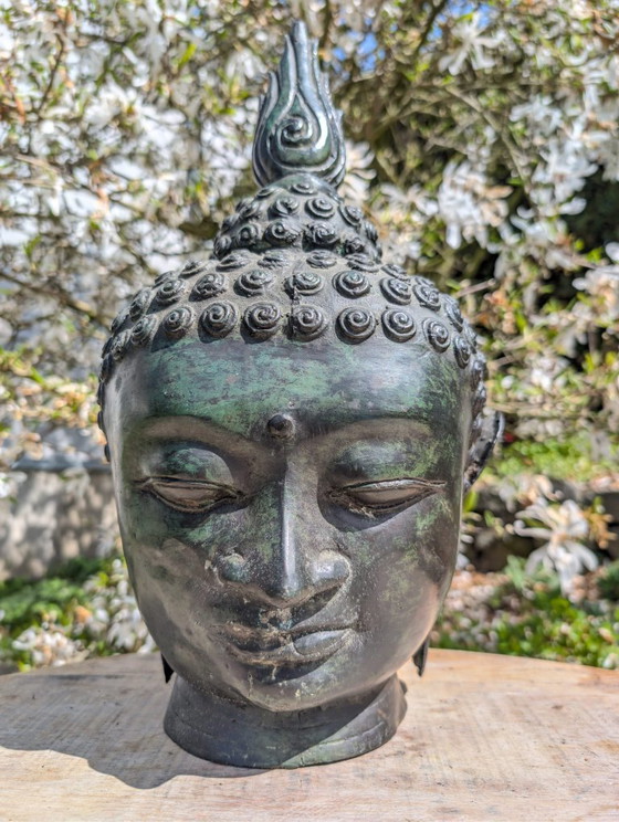 The face is calm and balanced, with a gentle expression that is instantly recognizable within the Buddhist image tradition. The flame-shaped ushnisha and the stylized scroll structure reinforce the classic character, while the size of 44 cm ensures a strong visual presence in any interior.