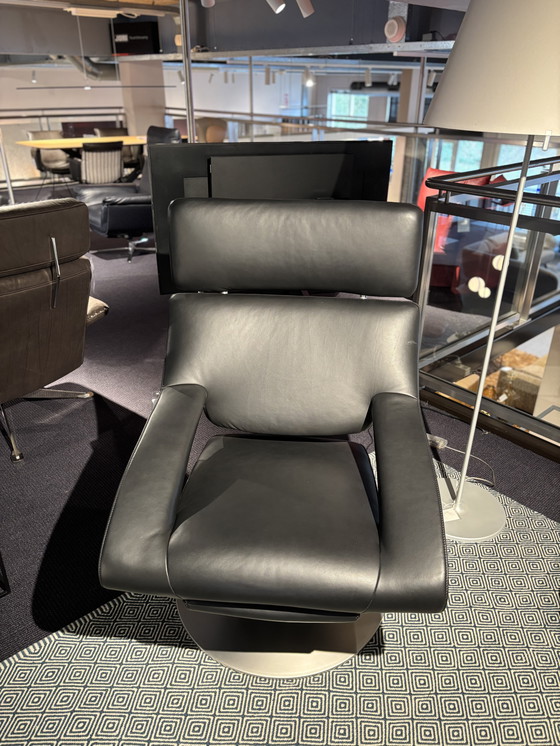 1x De Sede Recliner 0255/11, with extendable footrest. Fully upholstered in Touch leather, color black. Foot, matte chrome.