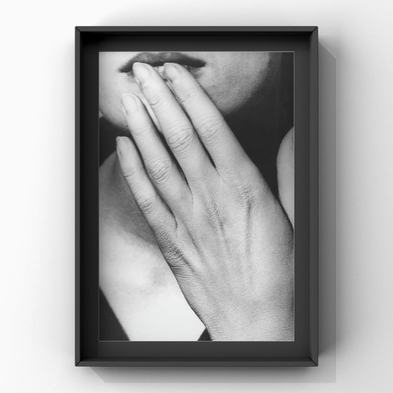 An iconic Surrealist portrait of Lee Miller, captured by Man Ray in Paris in 1928. This famous black-and-white photograph features a close-up of Miller's face, partially obscured by her hand—a powerful image that evokes both intimacy and alienation. The composition exemplifies Man Ray's visual language: minimalist, graphic, and sensual, with a subtle tension between anonymity and recognition.