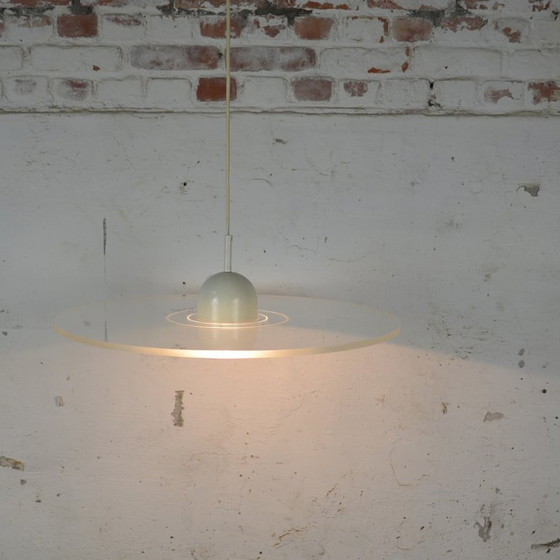 This iconic Plexiglas saucer pendant lamp, designed by PJ Copini and produced by Gepo in the 1970s, is a beautiful example of vintage design. With its clean lines and minimalist look, it adds a touch of retro elegance to any room. Crafted from Plexiglas and metal, it retains its original EU wiring. Perfect for fans of 1970s design.