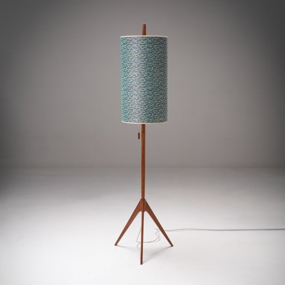 A Scandinavian floor lamp crafted from warm teak, set on a refined tripod base. Its sleek silhouette is crowned by a cylindrical shade upholstered in high-quality, subtly patterned Rubelli fabric. The result is a soft, atmospheric light that combines Scandinavian craftsmanship with elegant Italian textile design.
